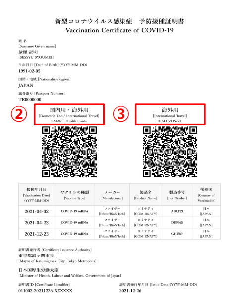 | ワクチン接種証明書必要事項 (英語での記載) | 氏名、生年月日 ワクチン接種日 ワクチンの製造元 証明書の発行機関名 |